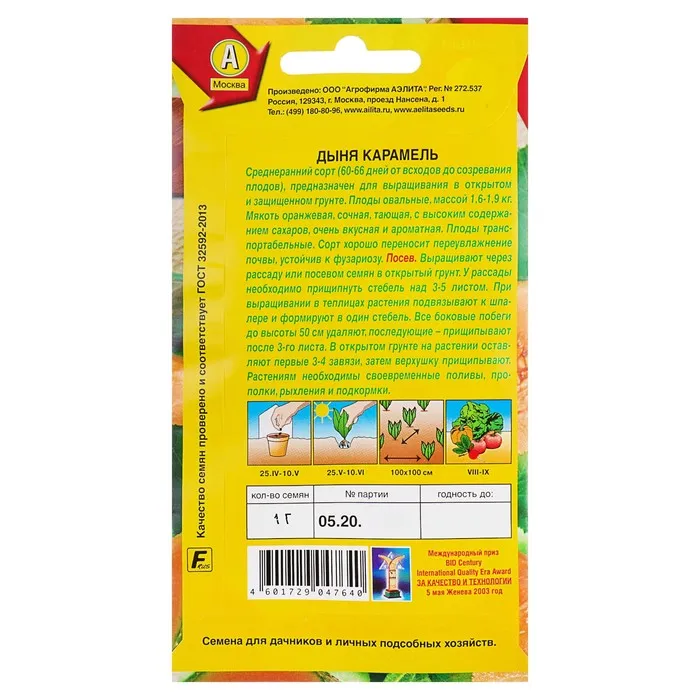 Среднеранний сорт (60-66 дней от всходов до созревания плодов), предназначен для выращивания в открытом и защищенном грунте. Плоды овальные, массой 1,6-1,9 кг. Мякоть оранжевая, сочная, тающая, с высоким содержанием сахаров, очень вкусная и ароматная. Плоды транспортабельные. Сорт хорошо переносит переувлажнение почвы, устойчив к фузариозу.