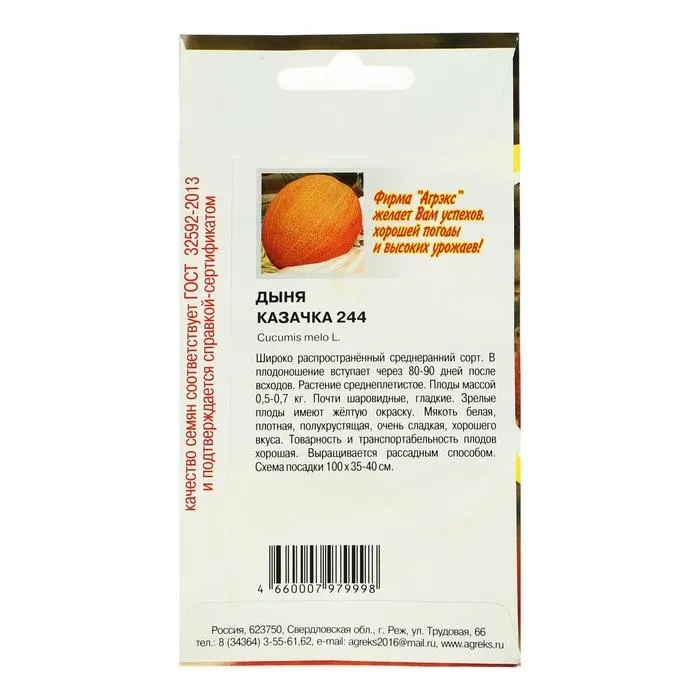 Среднеспелый (70-95 дней от всходов до плодоношения) сорт, предназначен для выращивания в пленочных теплицах. Посев на рассаду в конце апреля. Высадка рассады в конце мая – начале июня в возрасте 30-35 дней. В южных регионах выращивают в открытом грунте прямым посевом в апреле-мае. Схема посадки 70х150 см. Растения подвязывают к шпалере, до высоты 50 см удаляют все боковые побеги, последующие прищипывают над 1-3 листом. Полив умеренный, особенно в период плодоношения. На растении образуется 2-3 плода. Плоды овальные, средней величины, массой 1,2-1,8 кг. Поверхность гладкая, ярко-желтого цвета, без рисунка, иногда встречаются элементы сетки. Кора твердая, среднепрочная. Мякоть белая, средней толщины, слабохрустящая, плотная, сладкая. Семенное гнездо маленькое.