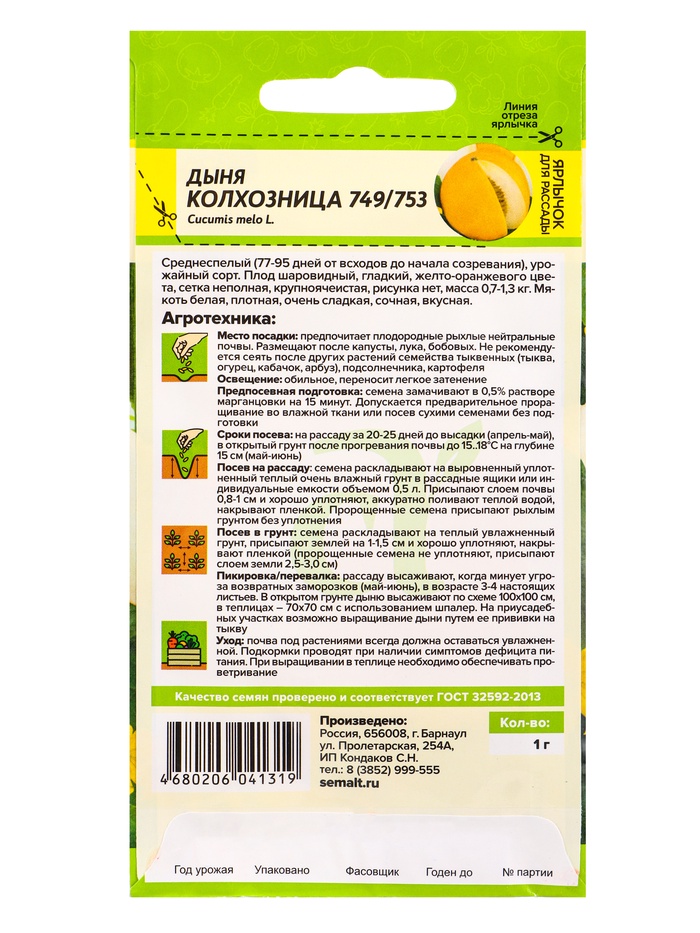 Семена Дыня "Колхозница 749/753", 1 г, «Семена Алтая» — Характеристики