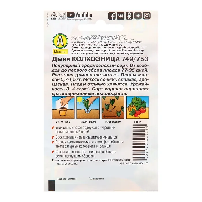 Благодаря внутреннему полиэтиленовому слою пакет не пропускает влагу и увеличивает срок годности семян до 2-ух лет.