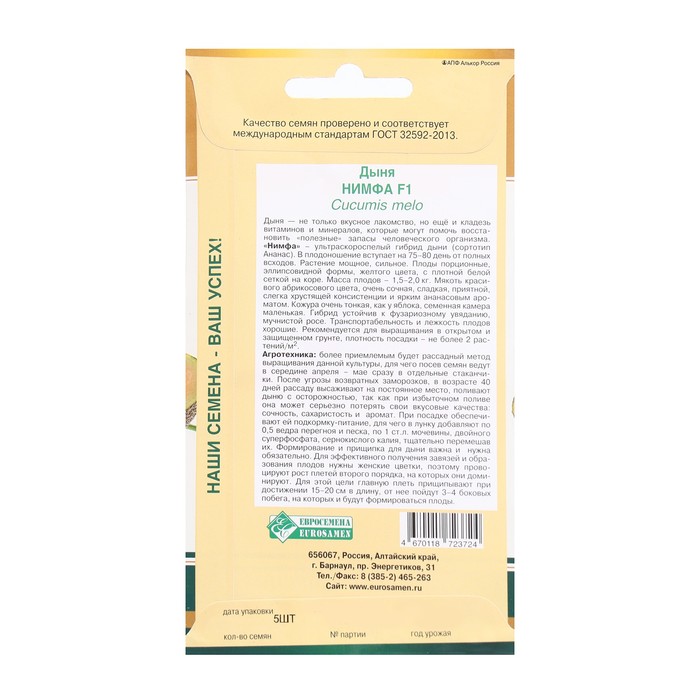 Ультраскороспелый гибрид сортотипа Ананас. В плодоношение вступает на 75-80 день от полных всходов. Растение мощное, сильное. Плоды порционные, эллипсовидной формы, желтого цвета, с плотной белой сеткой на коре. Масса плодов — 1,5-2,0 кг. Мякоть красивого абрикосового цвета, очень сочная, сладкая, приятной, слегка хрустящей консистенции и ярким ананасовым ароматом. Кожура очень тонкая, как у яблока, семенная камера маленькая. Гибрид устойчив к фузариозному увяданию (Fol), мучнистой росе (Px). Транспортабельность и лежкость плодов хорошие. Рекомендуется для выращивания в открытом и защищенном грунте, плотность посадки — не более 2 растений/м². При высоком уровне агротехники одно растение формирует до 4-5 плодов. Урожайность — свыше 12,0 кг/м².