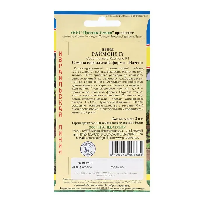 Дыня «Раймонд» — среднеранний, высокоурожайный гибрид израильской селекции. Устойчив к фузариозу и мучнистой росе. Растение плетистое с крупными или средними по размеру зелеными листьями. Плоды овальной формы, весом до 9 кг, вызревают через 70-75 дней после появления всходов, сохраняют товарные качества в течение 30-40 дней. Мякоть сочная, хрустящая, ароматная, с хорошим вкусом.