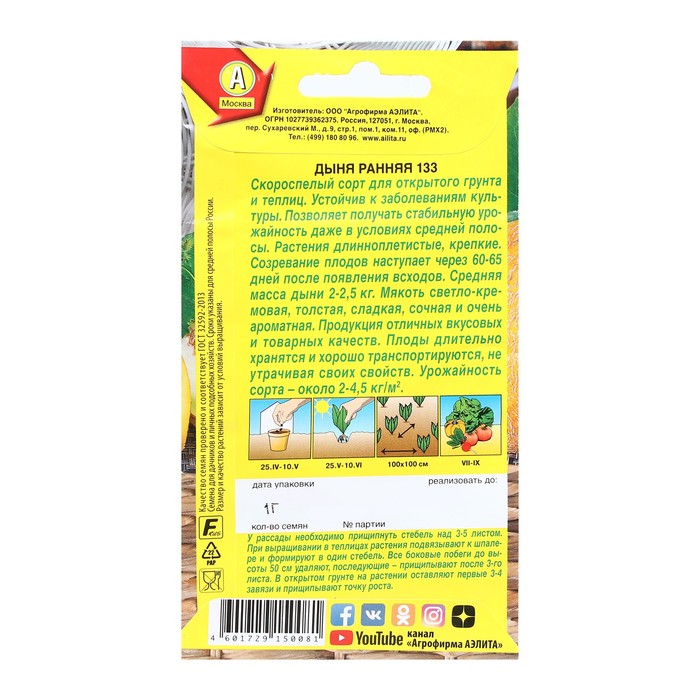 Скороспелый сорт для открытого грунта и теплиц. Устойчив к заболеваниям культуры. Позволяет получать стабильную урожайность даже в условиях средней полосы. Растения длинноплетистые, крепкие. Созревание плодов наступает через 60-65 дней после появления всходов. Средняя масса дыни 2-2,5 кг. Мякоть светло-кремовая, толстая, сладкая, сочная и очень ароматная. Продукция отличных вкусовых и товарных качеств. Плоды длительно хранятся и хорошо транспортируются, не утрачивая своих свойств. Урожайность сорта – около 2-4,5 кг/м2.