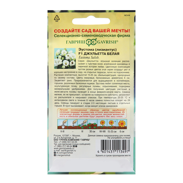Семена Эустома "Джульетта белая", ц/п, F1, 4 шт. — Характеристики