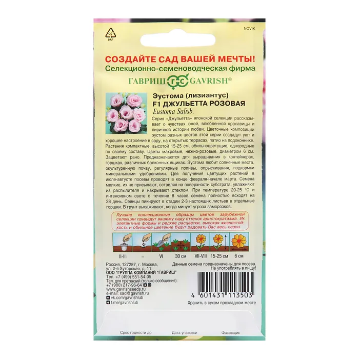 Семена Эустома "Джульетта розовая", ц/п, F1, 4 шт. — Характеристики