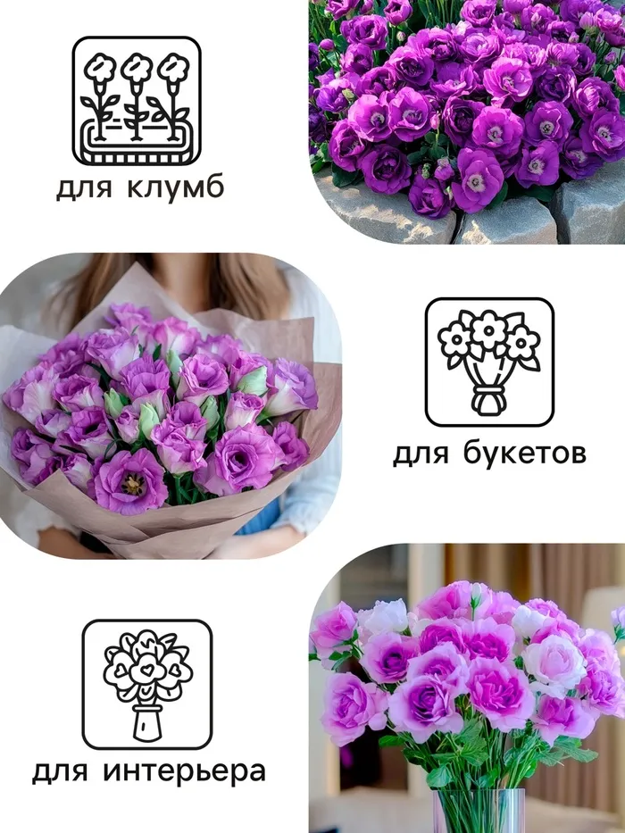 Воздушная эустома – идеальный цветок для букета. Современный срезочный гибрид американской селекции компании PanAmerican Seed – растение стройное, высотой 90-110 см, с зелено-сизой листвой восковой фактуры. Верхняя часть стебля сильно ветвится и образует массу бутонов, которые раскрываются поочередно. Цветки густомахровые, 6-8 см, с широкими лепестками, на крепких, длинных цветоносах. Гибрид эустомы восхищает красивыми цветками, а также удивляет необыкновенной стойкостью букетов в вазе. Растение подходит для выращивания в открытом грунте, в высоком пленочном тоннеле и в теп лице (круглогодично).