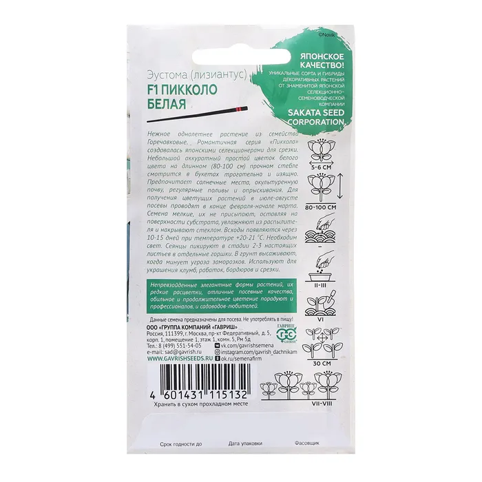 Семена Эустома "Пикколо", ц/п, белая, F1, 4 шт. — Характеристики