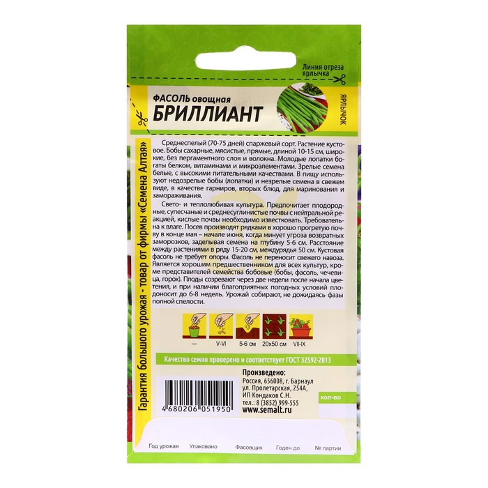 Среднеспелый (70-75 дней) спаржевый сорт. Растение кустовое. Бобы сахарные, мясистые, прямые, длиной 10-15 см, широкие, без пергаментного слоя и волокна. Молодые лопатки богаты белком, витаминами и микроэлементами. Зрелые семена белые, с высокими питательными качествами. В пищу используют недозрелые бобы (лопатки) и незрелые семена в свежем виде, в качестве гарниров, вторых блюд, для маринования и замораживания.Свето- и теплолюбивая культура. Предпочитает плодородные, супесчаные и среднесуглинистые почвы с нейтральной реакцией, кислые почвы необходимо известковать. Требовательна к влаге. Посев производят рядками в хорошо прогретую почву в конце мая — начале июня, когда минует угроза возвратных заморозков, заделывая семена на глубину 5-6 см. Расстояние между растениями в ряду 15-20 см, междурядья 50 см. Кустовая фасоль не требует опоры. Фасоль не переносит свежего навоза. Является хорошим предшественником для всех культур, кроме представителей семейства бобовые (бобы, фасоль, чечевица, горох). Плоды созревают через две недели после начала цветения и при наличии благоприятных погодных условий плодоносят до 6-8 недель. Урожай собирают не дожидаясь фазы полной спелости.