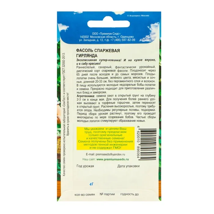 Раннеспелый, сахарный, фантастически урожайный, диетический сорт спаржевой фасоли. Плодоносит через 50-65 дней после всходов и до самых морозов. Плоды-лопатки очень большие, зелёного цвета, мясистые и сочные, длинной 20-33см, без пергаментного слоя и волокон. В пищу используются молодые недозрелые бобы-лопатки и семена. Прекрасно подходит для приготовления различных блюд и заморозки.
