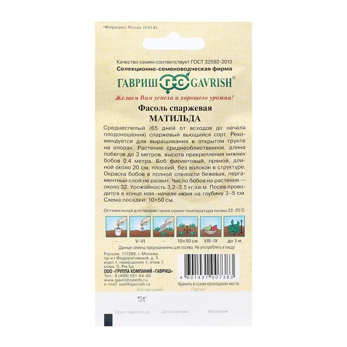 Спаржевая фасоль — распространенная бобовая культура, которая отличается нежной мякотью и отсутствием жестких волокон на стручках. Среднеспелый (65 дней от всходов до начала плодоношения) сорт для открытого грунта. Растение среднеоблиственное, вьющееся, длина побегов до 3 метров, высота прикрепления нижних бобов 0,4 метра. Боб фиолетовый, прямой, длиной около 20 см, плоский, без волокон в структуре. Окраска бобов в полной спелости бежевая, пергаментный слой не развит. Число бобов на растении около 32. Урожайность 3,2-3,5 кг/м2. Посев проводится в конце мая-начале июня на глубину 3-5 см. Схема посадки: 10x50 см.