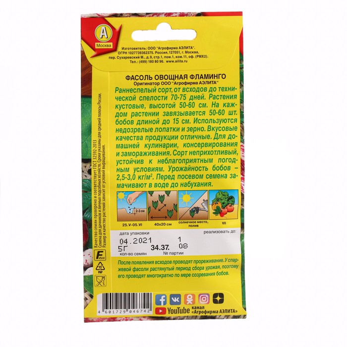Сорт раннеспелый, от всходов до технической спелости 55-60 дней. Растение кустовое, высыта куста 60 см. На одном растении 50-60 штук бобов, длиной до 15 см, красно-розового цвета, без пергаментного слоя и волокна. Семена светлые с ярко-розовыми штрихами. Очень ранняя, неприхотливая разновидность фасоли, отличающаяся отменной урожайностью в любой зоне. Используются недозрелые лопатки и зерно. Прекрасный продукт для употребления в Свежем виде, в домашней кулинарии, для консервирования и замораживания.