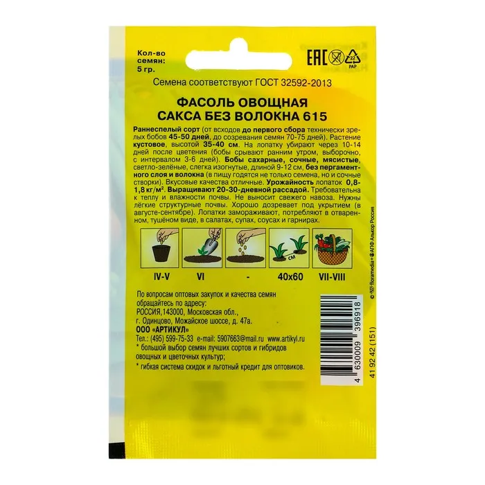 Раннеспелый сорт (от всходов до 1-го сбора технически зрелых бобов 45-50 дней, до созревания семян 70-75 дней). Растение кустовое, высотой 35-40 см. На лопатку убирают через 10-14 дней после цветения (бобы срывают ранним утром, выборочно, с интервалом 3-6 дней). Бобы сахарные, сочные, мясистые, светло-зелёные, слегка изогнутые, длиной 9-12 см, без пергаментного слоя и волокна (в пищу годятся не только семена, но и сочные створки). Вкусовые качества отличные. Урожайность лопаток 0,8-1,8 кг/м2. Выращивают 20-30-дневной рассадой. Перед посевом семена дезинфицируют в растворе марганцовки. Требовательна к теплу и влажности почвы. Не выносит свежего навоза. Нужны лёгкие структурные почвы, обеспеченные гумусом, чистые от сорняков, хорошо освещаемые и прогреваемые. Хорошо дозревает под укрытием (в августе-сентябре). Лопатки замораживают, потребляют в отваренном, тушёном виде, в салатах, супах, соусах и гарнирах.