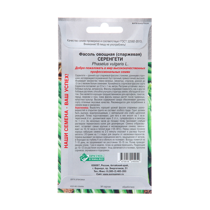 Раннеспелый сорт овощной фасоли. От всходов до технической спелости проходит около 55 дней. Растение мощное, прямостоячее, высотой 45-50 см, вегетативного типа. Бобы сильно вытянутые, длиной 14-16 см, диаметром 6-8 мм, тёмно-зелёного цвета, блестящие. Семена однородные, белого цвета. В 1 бобе содержится до 10 семян. Сорт устойчив к вирусу бобовых (BCMV), антракнозу (Cl1), ржавчине (Ur5). Сорт отличается отличной лежкостью и транспортабельностью, универсального назначения. Урожайность бобов в технической спелости 1,5-2,0 кг/м². Плотность посадки – 8-10 растений/м².
