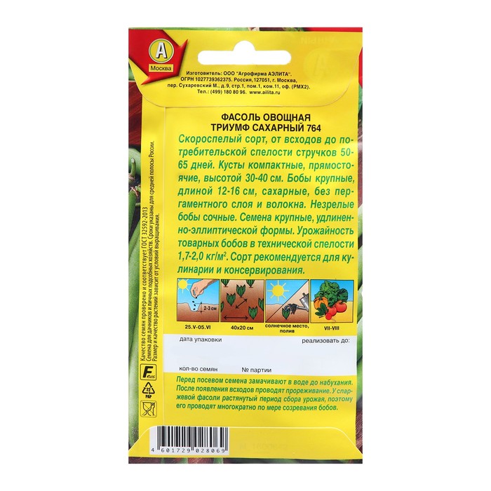 Семена Фасоль овощная "Триумф сахарный 764", скороспелая, 5 г — Характеристики