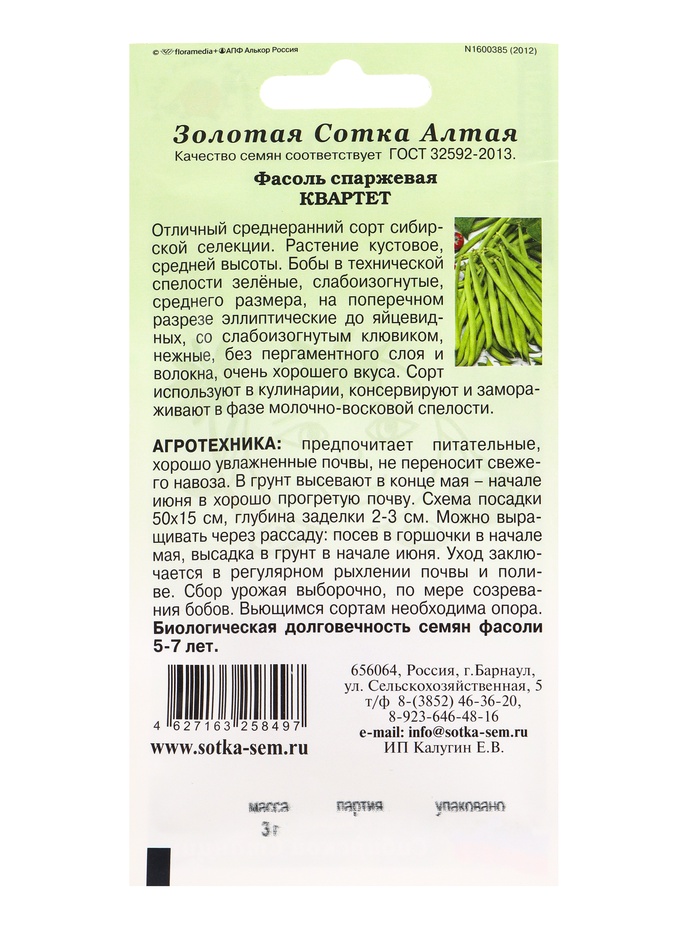 Семена Фасоль спаржевая «Квартет», 3 г, кустовая, «Золотая Сотка Алтая» — Характеристики