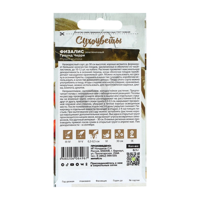 Оранжевые фонарики осеннего сада. С наступлением осени это растение готово радовать Вас живописными красками даже в дождливые хмурые дни. Редкий низкорослый сорт высотой до 30 см с многочисленными побегами, от середины до верхушек которых появляются пазушные цветки, до 10-12 штук на побеге. Физалис земляничный имеет некрупные ярко-апельсиновые ягоды, сладкие или кисло-сладкие на вкус. Спелые плоды употребляют в свежем виде, из них делают варенье, компоты, цукаты. Его необычные красно-оранжевые чашечки плодов, похожие на бумажные фонарики, приводят в восхищение. Используется для придания цветочным композициям «игрушечной» оригинальности, подчеркивания мелких деталей, оформления зимних букетов. Неприхотливое, светолюбивое, холодостойкое растение. Выращивают на солнечных участок с почвой нейтральной или слабощелочной реакции. Посевы семян на рассаду проводят в марте-апреле в рассадные ящики по схеме 6х8 см, тогда перед высадкой в грунт останется только разделить всходы на кустики. Высадка рассады в открытый грунт в начале июня, посадочный интервал – 25 см. Посевы в открытый грунт проводят в апреле-мае негусто в бороздки на глубину 0,5 см, сохраняя между рядами интервал в 30 см. Всходы прореживают. Можно сеять физалис и под зиму, в октябре. Цветение начинается в июле, появление плодов – в августе.