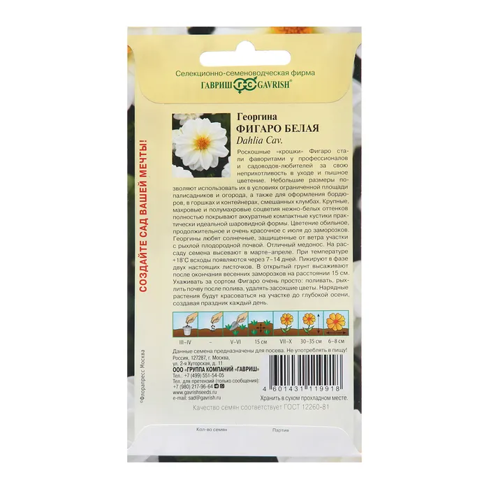 Семена Георгина "Фигаро", ц/п, белая 7 шт. — Характеристики