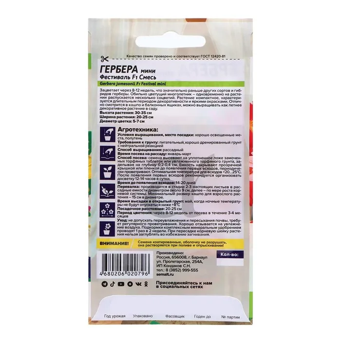 Новая уникальная серия миниатюрной герберы идеально подходит для высадки в смешанных контейнерах, для аранжировки домов и зимних садов. На низкорослом (до 20 см. высотой) растении одновременно распускается несколько цветков, напоминающих крупноцветковую ромашку. Данная серия отличается большим разнообразием ярких окрасок, компактными и выровненными растениями. Семена высевают в январе-марте в легкую землесмесь на глубину 0,2-0,3 см., дренаж из керамзита обязателен. Первые всходы появляются на 7-14 день. Зацветает через 7-10 месяцев после посева. Пересадку производят весной, используя горшки 14-20 см. в диаметре. При посадке и пересадке корневую шейку растения не заглублять во избежание загнивания. Недопустимо пересыхание земляного кома и заболачивание.
