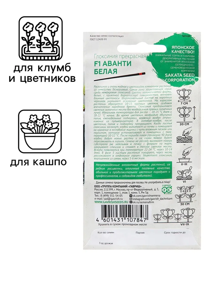 Семена на рассаду высевают поверх субстрата (не заделывая в почву) с февраля по март, накрывают стеклом и ставят в теплое, светлое место. Всходы появляются при температуре 22-24°С, через 10-14 дней. В фазе 3-х листьев растения пикируют, через месяц рассаживают в отдельные горшки. Зацветает глоксиния, выращенная из семян через 9-10 месяцев.