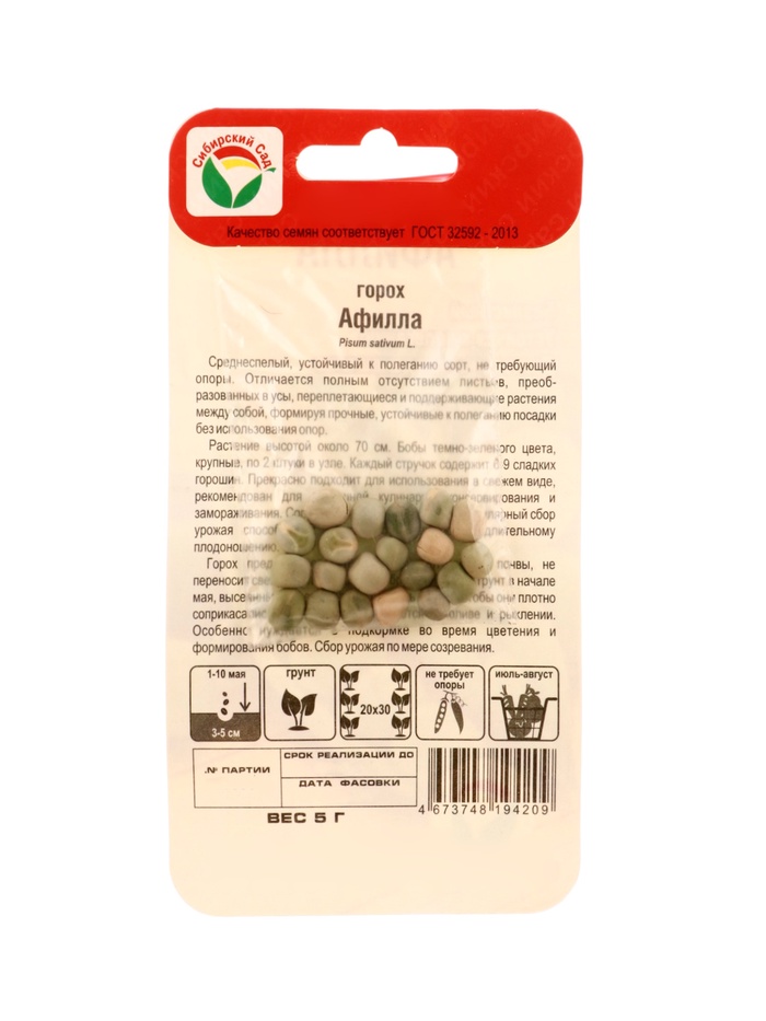 Семена Горох «Афилла», 5 г, безлистный, «Сибирский сад» — Характеристики