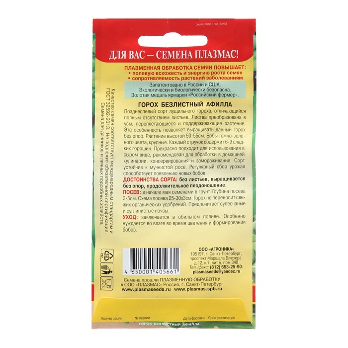Семена Горох "Афилла", безлист., 5 г — Характеристики
