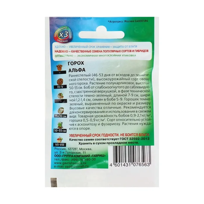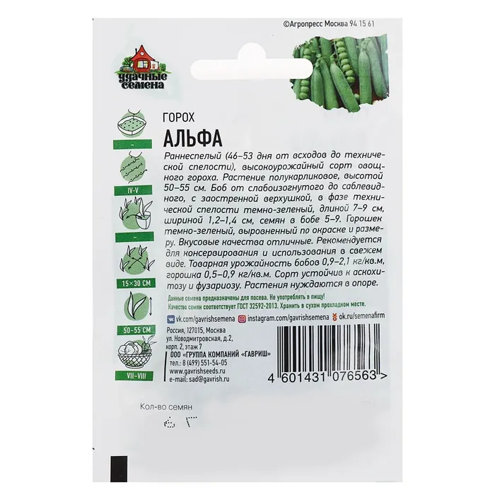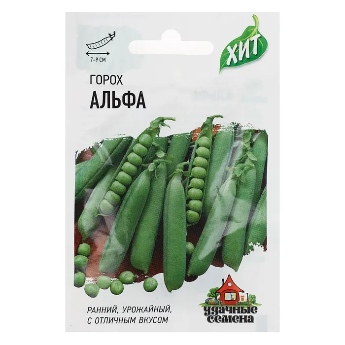 Раннеспелый (46-53 дня от всходов до технической спелости), высокоурожайный сорт овощного гороха. Растение полукарликовое, высотой 50-55 см. Боб от слабоизогнутого до саблевидного, с заостренной верхушкой, в фазе технической спелости темно-зеленый, длиной 7-9 см, шириной 1,2-1,4 см, семян в бобе 5-9. Горошек темно-зеленый, выровненный по окраске и размеру. Вкусовые качества отличные.