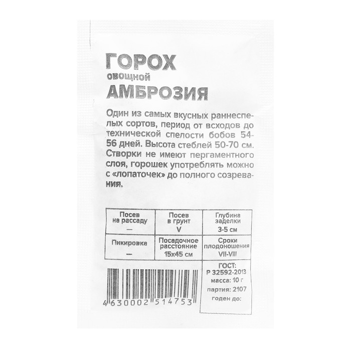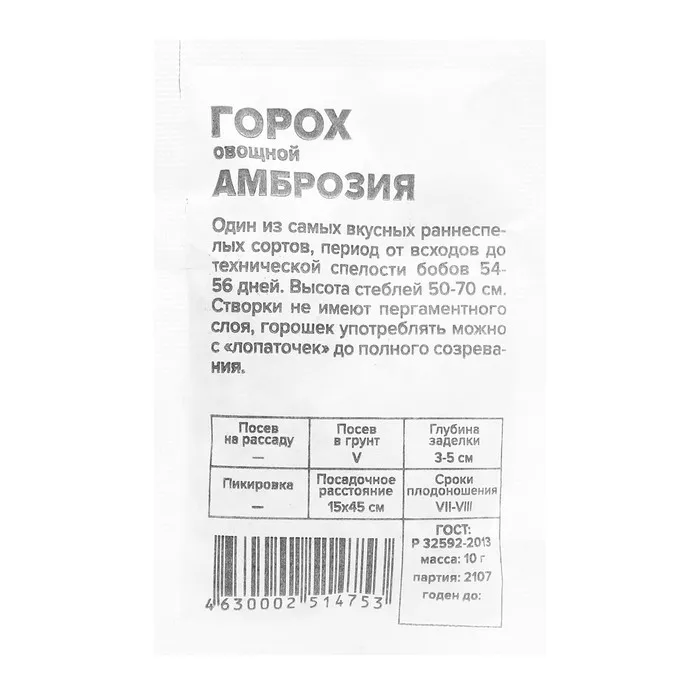 Один из самых вкусных раннеспелых сортов, период от всходов до технической спелости бобов 54-56 дней. Высота стеблей 50-70 см. Створки не имеют пергаментного слоя, горошек употреблять можно с «лопаточек» до полного созревания. Холодостойкая влаголюбивая культура. Предпочитает плодородные, супесчаные и среднесуглинистые почвы с нейтральной или слабокислой реакцией. Очень важна хорошая аэрация и обеспеченность влагой в течение вегетации. Размещают на освещенных участках. Семена высевают в открытый грунт в начале мая. Глубина заделки семян составляет 3-4 см на тяжелых и 4-5 см на легких почвах. Семена прорастают при температуре 2-5°С, всходы выдерживают кратковременные заморозки до -6°С. Схема посадки 15х45 см. При необходимости для опоры растений устанавливают шпалеры. Для повышения качества урожая рекомендуется проводить подкормку микроудобрениями, содержащими бор и молибден. Является хорошим предшественником для всех культур, кроме представителей семейства бобовые (бобы, фасоль, чечевица, горох).