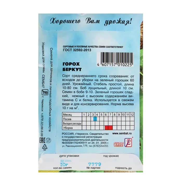 Среднеспелый сорт лущильного гороха. Растение среднеоблиственное, стебель длиной 70-80 см. Бобы слабоизогнутые, длинные ( до 10 см), узкие. темно-зеленые с 9-10 горошинами. Сорт отличается высокой урожайностью, дружным формированием урожая, высоким качеством горошка, отличными вкусовыми качествами и устойчивостью к полеганию. В пищу используют семена в стадии молочной спелости. Зеленый горошек сладкий, нежный, с высоким содержанием аскорбиновой кислоты и белка. Сорт рекомендуется для употребления в свежем виде, замораживания и консервирования, идеален для приготовления гарниров и супов.