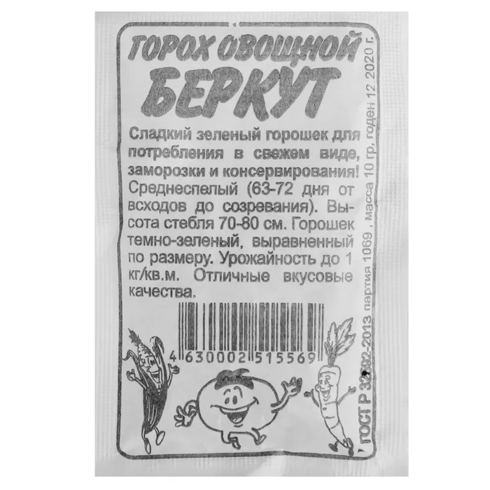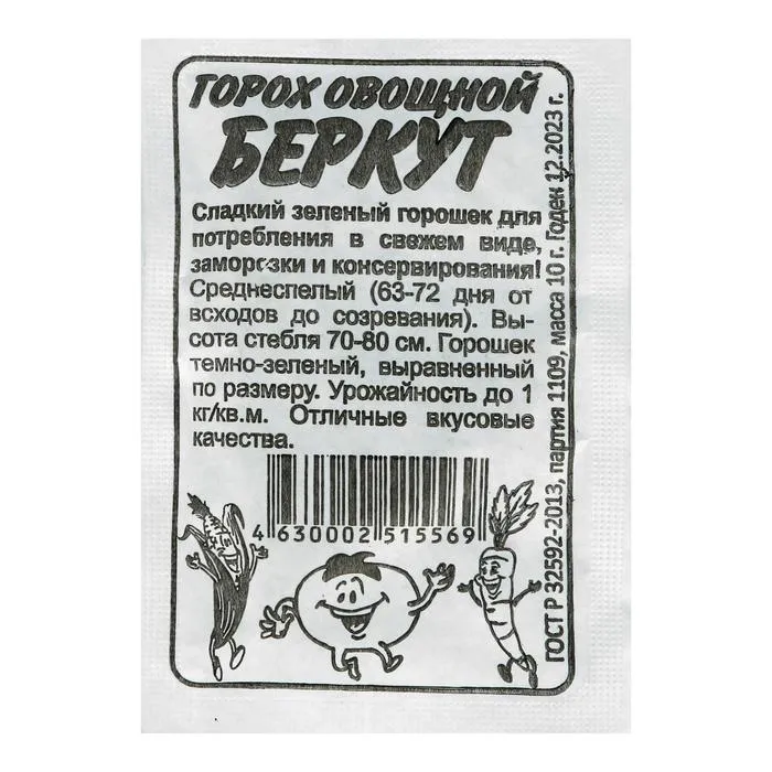 Среднеспелый (63-72 дня от всходов до созревания). Высота стебля 70-80 см. Горошек темно-зеленый, выровненный по размеру. Урожайность до 1 кг/кв.м. Отличные вкусовые качества. Лучше растет на плодородных, богатых кальцием, супесчаных и среднесуглинистых почвах с нейтральной или слабокислой реакцией. Очень важна хорошая аэрация почвы. Размещают на освещенных участках.