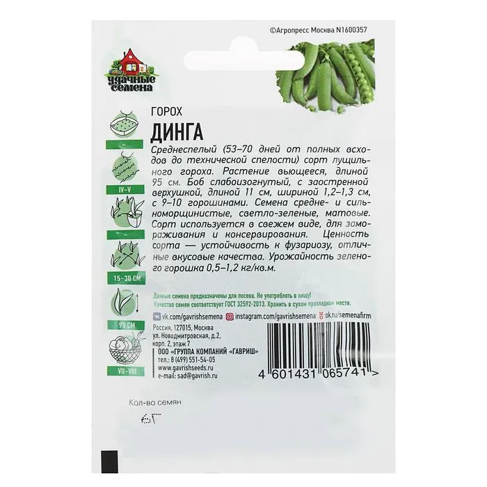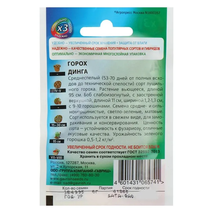 Среднеспелый (53-70 дня от полных всходов до технической спелости) сорт лущильного гороха. Стебель простой, длиной 95 см. Боб слабоизогнутый, с заостренной верхушкой, длиной 11 см, шириной 1,2-1,3 см, с 9-10 горошинами. Семена средне- и сильноморщинистые, светло-зеленые, матовые. Посев семян в апреле-мае во влажную подготовленную почву. Растения требуют опоры. Сорт используется в свежем виде, для замораживания и консервирования. Ценность сорта — устойчивость к фузариозу, отличные вкусовые качества. Урожайность зеленого горошка 0,5-1,2 кг/м2.