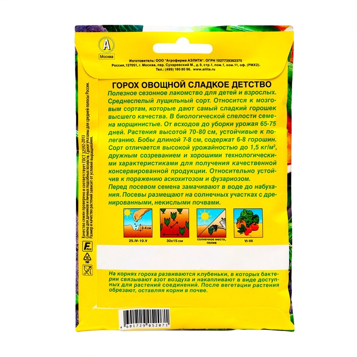 Раннеспелый лущильный сорт, период от полных всходов до первого сбора урожая 50-55 дней. Растения высотой 60-70 см, устойчивые к полеганию, с дружным созреванием бобов. Бобы средней длины (7-8 см), содержат 6-8 горошин. Горошек в потребительской спелости темно-зеленый, выравненный по размеру, сочный, с нежным, сладким вкусом, с богатым витаминно-белковым комплексом. Полезное сезонное лакомство для детей и взрослых. Сорт отличается высокой урожайностью (1,5 кг/м2) и хорошими технологическими характеристиками для получения качественного консервированного зеленого горошка. Относительно устойчив к поражению аскохитозом и фузариозом.
