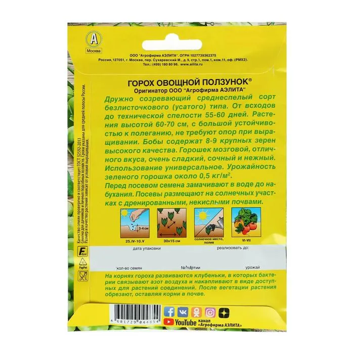 «Ползунок» — дружно созревающий среднеспелый сорт гороха. Растение устойчиво к полеганию, хорошо противостоит ветру и дождям. Формирует длинные прямые бобы (по 8–9 семян в каждом). Горошек получается нежный, сочный и сладкий.