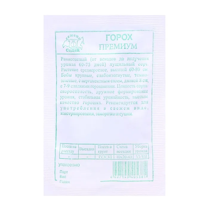 Среднеспелый (55-57 дней от полных всходов до технической спелости горошка) сорт овощного гороха. Посев ранней весной на солнечной стороне участка на глубину 4-6 см. Высота растения 80 см. Бобы среднеизогнутые, с тупой верхушкой, длиной около 8 см, 9-семянные, темно-зеленые, пергаментный слой имеется. Горошек в технической спелости зеленый, выравненный по размеру. Созревание бобов дружное. Рекомендуется для использования в свежем виде, для замораживания и консервирования. Вкусовые качества хорошие. Урожайность зеленого горошка 0,4-0,6 кг/м2. Схема посева: 15x30 см.