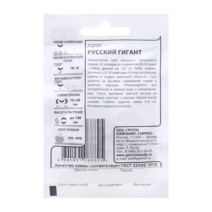 Семена Горох «Русский гигант», 6 г, «Гавриш» — Характеристики
