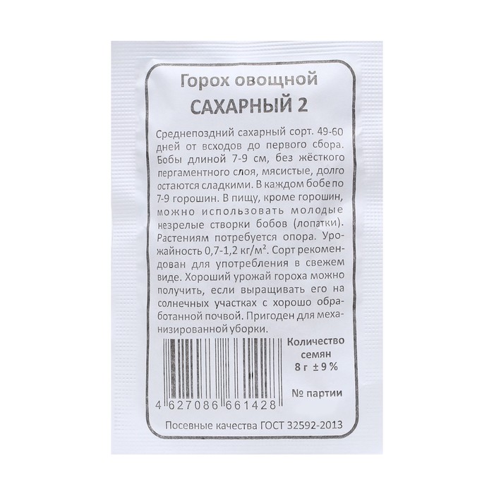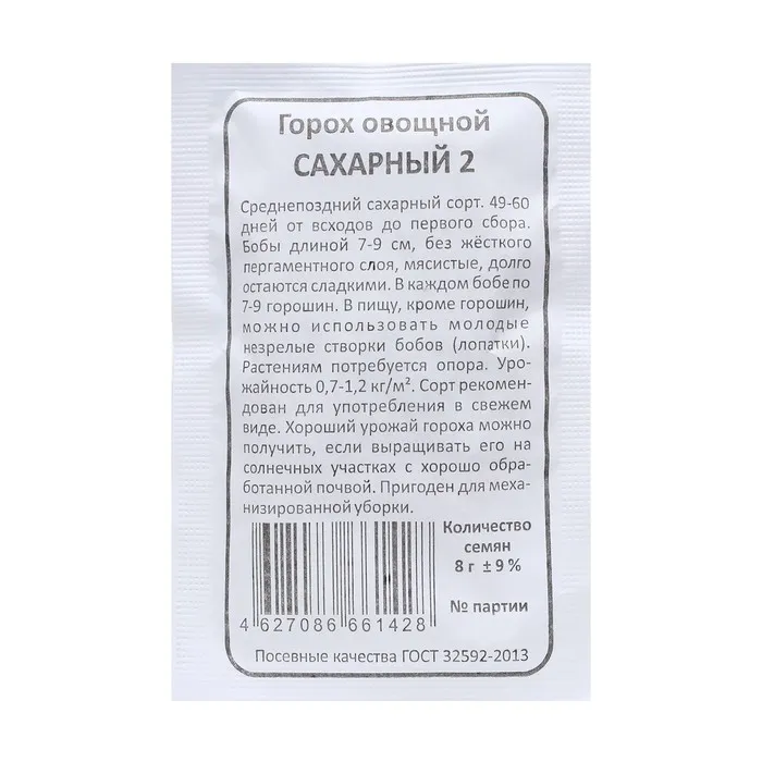 Среднеранний сорт с очень высоким содержанием сахара. Взрослое растение достигает высоты 80 см, формирует сочные, мясистые стручки без пергаментного слоя, в каждом из них созревает до 11 семян. В пищу употребляются как молодые светло-зеленые бобы, так и спелые горошины.