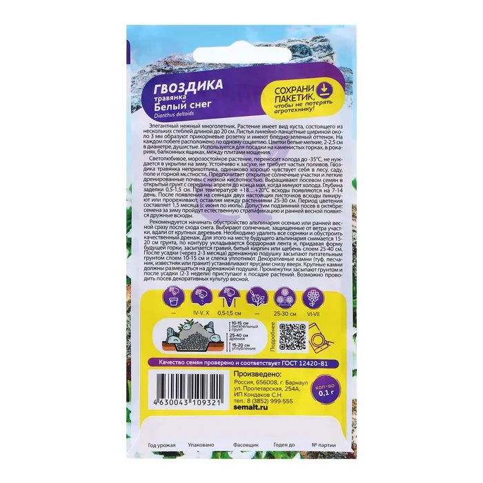 Элегантный нежный многолетник. Растение имеет вид куста, состоящего из нескольких стеблей длиной до 20 см. Листья линейно-ланцетные шириной около 3 мм образуют прикорневые розетку и имеют бледно-зеленый оттенок. На каждом побеге расположено по одному соцветию. Цветки белые мелкие, 2-2,5 см в диаметре, душистые. Используется для посадки на каменистых горках, в рокариях, балконных ящиках, между плитами мощения. Светолюбивое, морозостойкое растение, переносит холода до -35°С, не нуждается в укрытии на зиму. Устойчиво к засухе, не требует частых поливов. Гвоздика травянка неприхотлива, одинаково хорошо чувствует себя в лесу, саду, поле и горной местности. Предпочитает открытые солнечные участки и легкие дренированные почвы с низкой кислотностью. Выращивают посевом семян в открытый грунт с середины апреля до конца мая, когда минуют холода. Глубина заделки 0,5-1,5 см. При температуре +18…+20°C всходы появляются на 7-14 день. После появления на сеянцах двух настоящих листочков всходы пикируют или прореживают, оставляя между растениями 25-30 см. Период цветения составляет 1,5 месяца (с июня по июль). Допустим подзимний посев в октябре: семена за зиму пройдут естественную стратификацию и ранней весной появятся дружные всходы.
