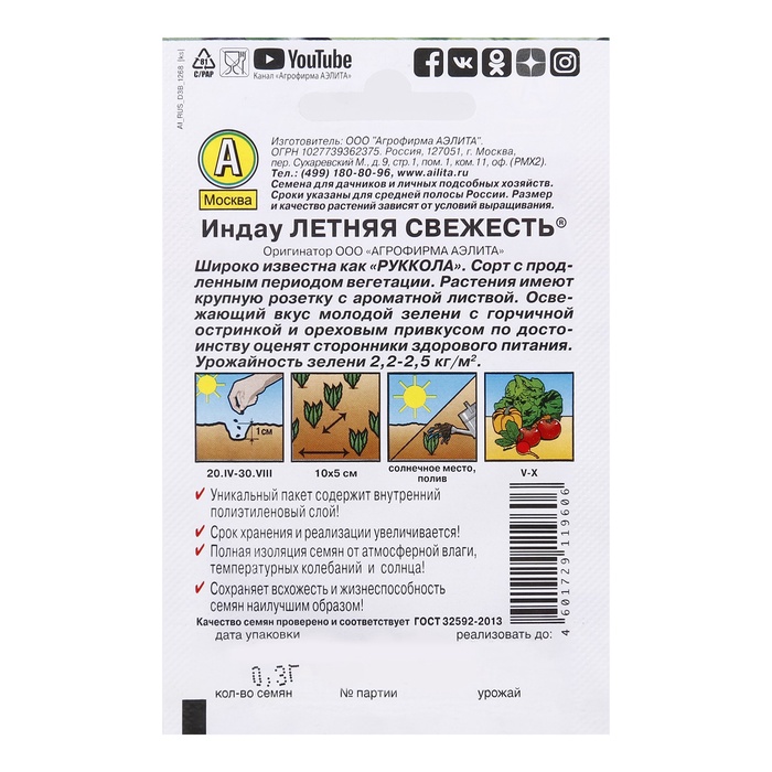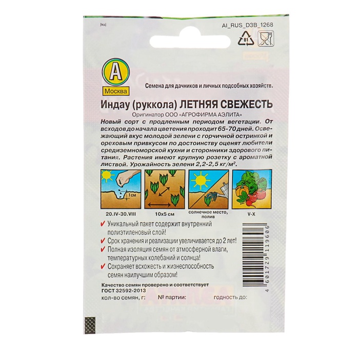 Индау (руккола) «Летняя свежесть» — новый сорт с продлённым периодом вегетации. От всходов до начала цветения проходит 65–70 дней. Освежающий вкус молодой зелени с горчичной остринкой и ореховым привкусом по достоинству оценят любители средиземноморской кухни и сторонники здорового питания. Растения имеют крупную розетку с ароматной листвой. Урожайность зелени — 2,2–2,5 кг/м².