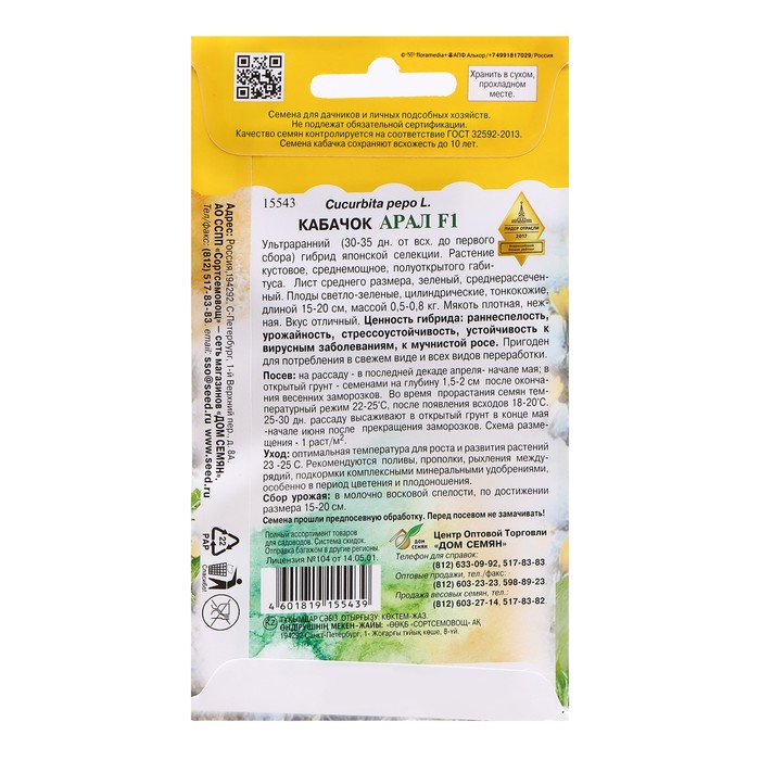 Семена Кабачок Арал. Очень ранний (30 дней от всходов до первого сбора плодов) гибрид. Растение полуплетистое. Плоды в технической спелости цилиндрические, слаборебристые, светло-зеленые, длиной 12-15 см, диаметром 4-6 см, массой 0,5-0,8 кг. Мякоть плотная, нежная, с отличным вкусом. Гибрид устойчив к основным заболеваниям кабачков. Урожайность до 10 кг/м. Плоды употребляют в вареном, тушеном и жареном виде, а также свежими (молодые завязи) в салатах. Из них получается аппетитное консервированное ассорти. Зрелые крупные плоды хранятся до 4 месяцев.