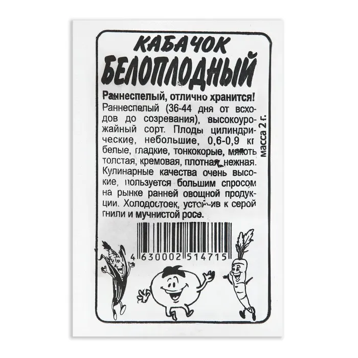 Раннеспелый (36-44 дня от всходов до созревания), кустовой, высокоурожайный сорт. Плоды цилиндрические, небольшие, 0,6-0,9 кг, белые, гладкие, тонкокорые, мякоть толстая, кремовая, плотная, нежная. Кулинарные качества очень высокие, пользуется большим спросом на рынке ранней овощной продукции. Холодостоек, устойчив к серой гнили и мучнистой росе. Семена сеют непосредственно в грунт, когда минует угроза возвратных заморозков. Для получения ранней продукции кабачки сеют на рассаду поздней весной, за две-три недели до высадки. Схема посадки 100х100 см, глубина заделки семян 3-5 см. При раннем посеве или посадке рассады в открытый грунт необходимо временное укрытие пленкой. Для получения наиболее высокого урожая рекомендуется регулярно проводить рыхление почвы и умеренные поливы. В период цветения-налива плодов рекомендуется провести подкормку комплексными минеральными удобрениями. Сбор урожая по мере созревания плодов. Не требует формировки.