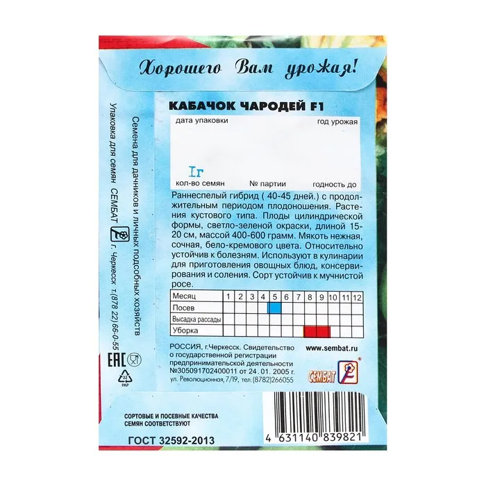 Условия выращивания: Для максимального урожая место, отведенное под кабачки, должно быть богато органикой и хорошо освещаться солнечным светом. Посев семян проводится через рассаду в апреле или непосредственно в грунт в конце мая. Сеют семена в лунки с расстоянием между лунками не менее 50 см. На глубину от 4 до 7 см., в зависимости от типа почвы. Уход заключается в регулярном поливе, подкормках, рыхлении и сборе товарных плодов