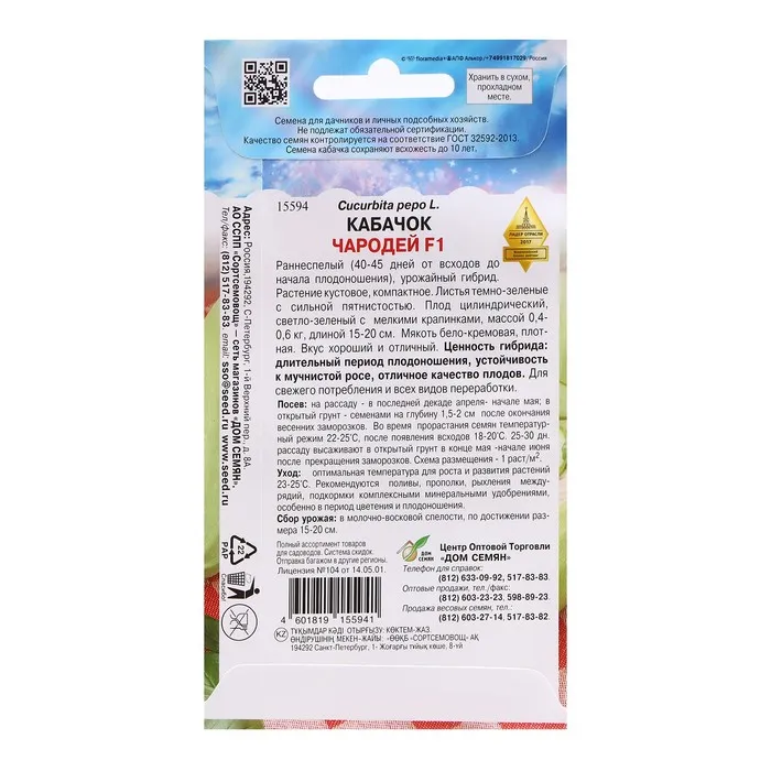 Раннеспелый, 40-45 дней, очень урожайный гибрид с продолжительным периодом плодоношения. Растение кустовое, компактное. Плоды красивые, однородные, цилиндрической формы, белые с мелкими точками, длиной 16-20 см, массой 400-800 грамм. : Для максимального урожая место, отведенное под кабачки, должно быть богато органикой и хорошо освещаться солнечным светом. Посев семян проводится через рассаду в апреле или непосредственно в грунт в конце мая. Сеют семена в лунки с расстоянием между лунками не менее 50 см. На глубину от 4 до 7 см., в зависимости от типа почвы. Уход заключается в регулярном поливе, подкормках, рыхлении и сборе товарных плодов.