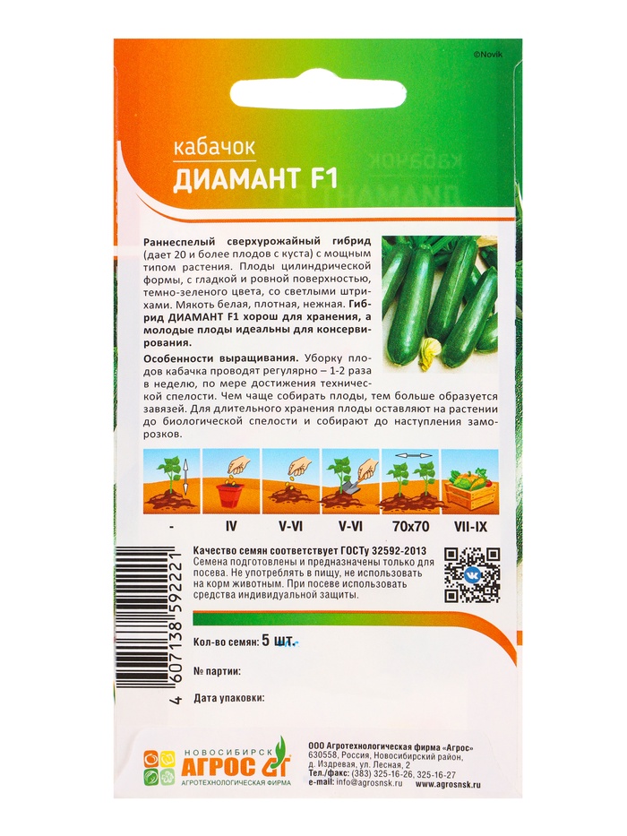 Семена Кабачок «Диамант», F1, 5 шт., «Агрос» — Характеристики