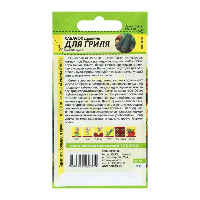 Раннеспелый (49-51 день) сорт. Растение кустовое, компактное. Плоды цилиндрические, массой 0,7- 0,9 кг. Кора тонкая, мякоть белая, сочная, хрустящая, отличных вкусовых качеств. Великолепно подходит для различной кулинарной переработки, заморозки, лучший сорт для приготовления на гриле. Семена сеют непосредственно в грунт, когда минует угроза заморозков. Схема посадки 150х60 см, глубина заделки семян 3-5 см. Для раннего получения продукции семена кабачков сеют на рассаду после 30 апреля. При раннем посеве или посадке рассады в открытый грунт необходимо временное укрытие пленкой. Для получения наиболее высокого урожая желательно регулярно про-водить рыхление почвы. Сбор урожая по мере созревания плодов.