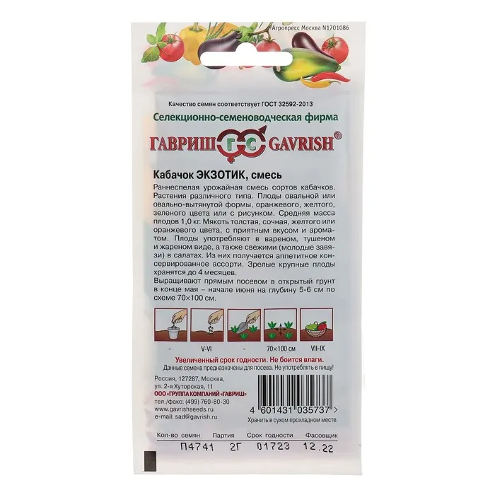 Раннеспелая урожайная смесь сортов кабачков. Растения различного типа. Плоды овальной или овально-вытянутой формы оранжевого, желтого, зеленого цвета или с рисунком. Средняя масса плодов 0,8-1,0 кг. Мякоть толстая, сочная, желтого или оранжевого цвета, с приятным вкусом и ароматом. Выращивают прямым посевом в открытый грунт в конце мая — начале июня на глубину 5-6 см по схеме 70х100 см. Плоды употребляют в вареном, тушеном и жареном виде, а также свежими (молодые завязи) в салатах. Из них получается аппетитное консервированное ассорти. Зрелые крупные плоды хранятся до 4 месяцев.