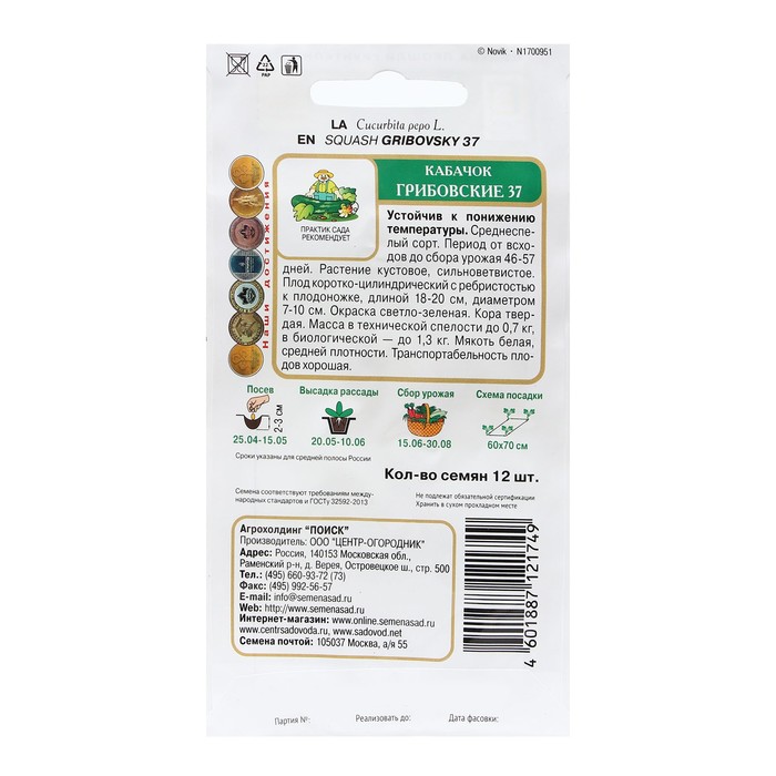 Семена Кабачок «Грибовские 37», 12 шт., «ПОИСК» — Характеристики