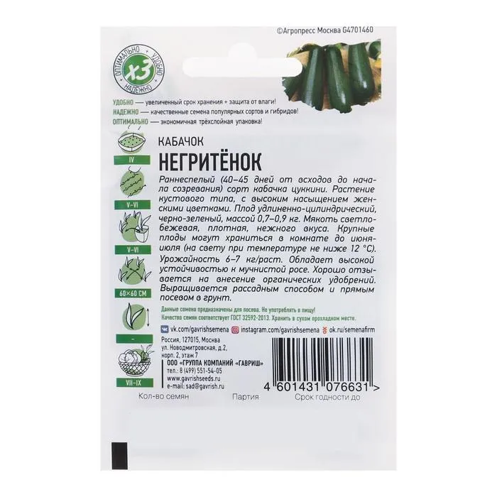 Раннеспелый (40-45 дней от всходов до созревания) сорт. Выращивается как рассадным способом, так и прямым посевом в грунт. Посев на рассаду - в апреле, высадка рассады в грунт - в мае – июне. Посев непосредственно в грунт в конце мая – июне. Хорошо отзывается на внесение органических удобрений. Растение кустового типа, слабо облиственное с высоким насыщением женских цветков. Плод удлиненно-цилиндрический, черно-зеленый, массой 0,7-0,9 кг. Кора средней толщины. Мякоть светло-бежевая, плотная. Обладает высокой устойчивостью к мучнистой росе. Нежный вкус. Молодые завязи (10-15 см) используют вместо огурцов в салатах. Крупные плоды (1 кг и более), собранные до заморозков и ночных холодов, могут храниться в комнате до июня-июля (на свету при температуре не ниже 12°C). Схема посадки 60x60 см. Урожайность 6,0-7,0 кг/растение.