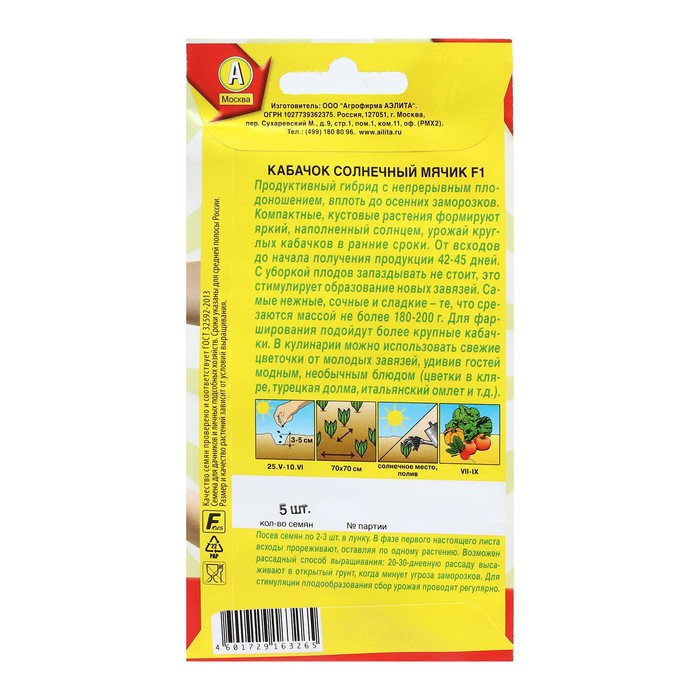 Семена Кабачок «Солнечный мячик», F1, 5 шт., «Аэлита» — Характеристики