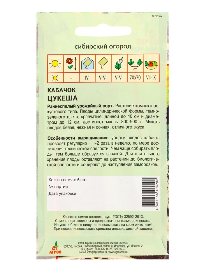 Семена Кабачок «Цукеша», 6 шт., «Агрос» — Характеристики
