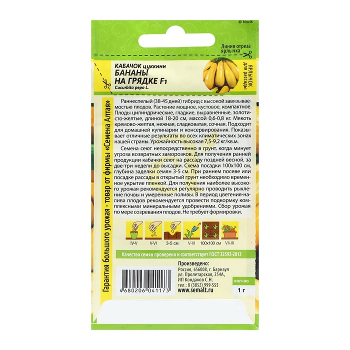 Раннеспелый (38-45 дней) гибрид с высокой завязываемостью плодов. Растение мощное, кустовое, компактное. Плоды цилиндрические, гладкие, выравненные, золотисто-желтые, длиной 18-20 см, массой 0,6-0,8 кг. Мякоть кремово-желтая, нежная, сладковатая, сочная. Подходит для домашней кулинарии и консервирования. Показывает отличные результаты во всех климатических зонах нашей страны. Урожайность высокая 7,5-9,2 кг/м². Семена сеют непосредственно в грунт, когда минует угроза возвратных заморозков. Для получения ранней продукции кабачки сеют на рассаду поздней весной, за две-три недели до высадки. Схема посадки 100х100 см, глубина заделки семян 3-5 см. При раннем посеве или посадке рассады в открытый грунт необходимо временное укрытие пленкой. Для получения наиболее высокого урожая рекомендуется регулярно проводить рыхление почвы и умеренные поливы. В период цветения-налива плодов рекомендуется провести подкормку комплексными минеральными удобрениями. Сбор урожая по мере созревания плодов. Не требует формировки.