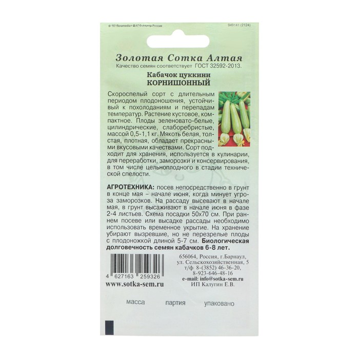 Семена Кабачок цукини «Корнишонный», ранний, 1 г, «Золотая сотка Алтая» — Характеристики